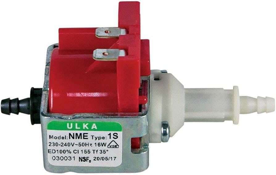 Vandens siurblys dulkių siurbliui, kavos aparatui ULKA, NME1S, 16W atvamzdžių išoriniai diametrai Ø 5 mm ir Ø 6,5 mm; ritės aukštis 29mm, plotis 38mm; vožtuvo aukštis 77mm